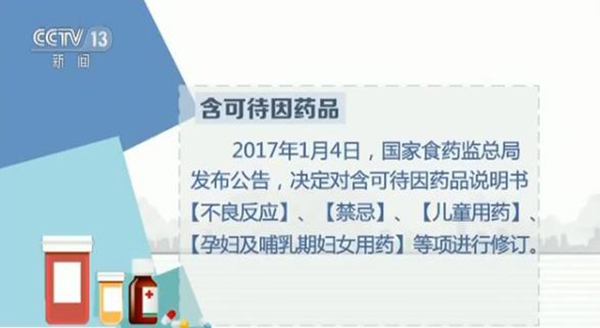 2017年1月4日,国家食药监总局发布公告,决定对含可待因药品说明书【不良反应】、【禁忌】、【儿童用药】、【孕妇及哺乳期妇女用药】等项进行修订。