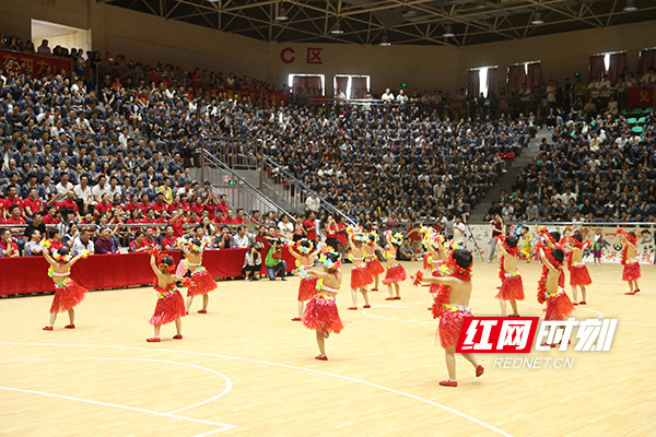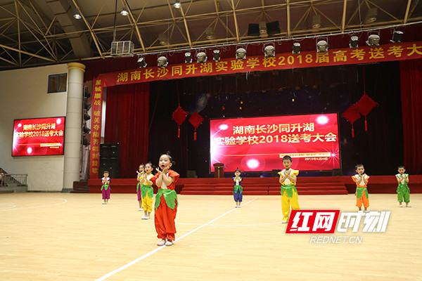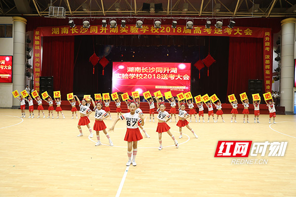 6月6日上午,湖南长沙同升湖实验学校举行2018届高三毕业送考大会。图为小学部的同学们表演为高考学子送行。