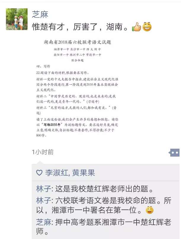 2018年1月,湘潭市一中高三年级收到了《湖南省2018届高三“六校联考”工作方案》的通知,接受了命制此次考试语文试题的任务。接到任务后,我们高三语文备课组八位老师在备课组长周岚的组织下,召开了第一次会议,学习“六校联考”工作方案,明确命题要求,分配命题任务,落实交稿、审稿的具体时间。楚红辉老师有着丰富的教学经验和独到的教学见解,所以老师们一致推荐楚老师来命制此次考试作文题。