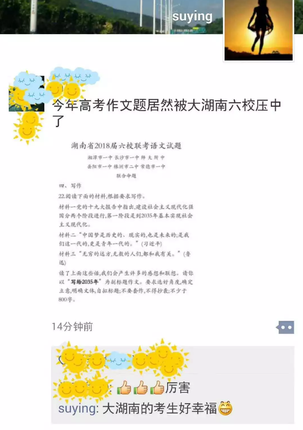 据湘潭市一中教育集团微信公众号消息,6月7日上午,伴随着975万考生交上语文试卷,“00后”高考首秀已经过去1/4,湖南省采用的全国I卷作文题也随之出炉。这道万众聚焦的作文题目,一如往年引起了社会各界的关注,成为最热门的话题。而湘潭市一中的高三考生们感到特别“幸运”,因为我们的语文老师“押中”了作文题!