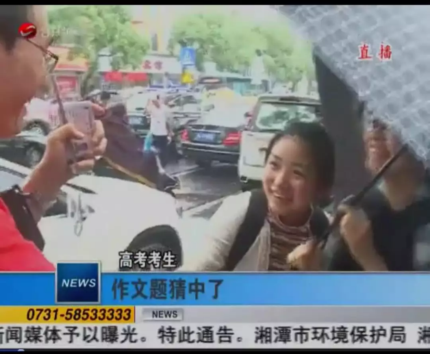 今天上午的语文考试结束后,市一中的考生们轻松地迈出考场,一位学生看到楚老师,激动地走过来与他握手,拥抱。“作文题,猜中了!”在校门外送考的楚老师才知道自己曾经命过的这道作文题在价值取向和题材上与今年的高考题非常相似。送考的家长闻讯后都拥过来与楚老师热情地握手,“一中的语文老师太牛了!”而这一幕也被湘潭公共频道“都市日记”的记者抓拍到,随即对楚老师进行了采访。回答记者采访时楚老师欣慰地说:“考生们对题材很熟悉,这是最好的事情。有话可写,能写出自己的感觉,甚至真感情,还是不错的。”
