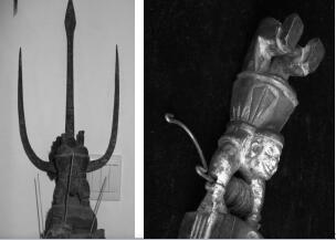 梅山神虽然地位卑微,却也是当地人心目中的得罪不起的鬼神。在梅山祭祀的傩坛上,他只是一位被放置在神案下、或搁置在屋檐下的小鬼;但在猎人狩猎或木匠务工之际,他又是与人们形影相随的小神(如图:猎叉、墨斗)。