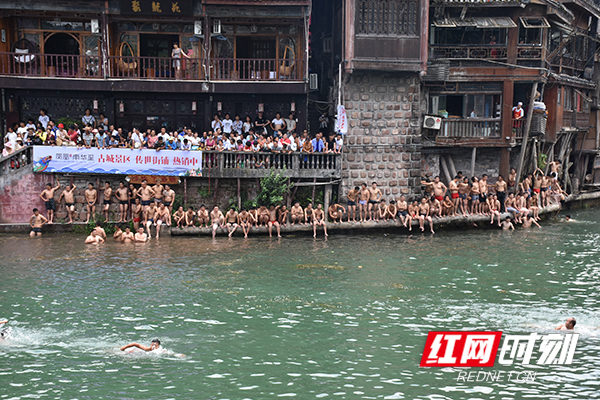 龙舟赛过后,下午便迎来了凤凰端午节的重头戏抢鸭子活动。活动还未开始,众多男青年早已光着膀子在岸边等候多时,他们迫不及待地跃入水中,等待工作人员将鸭子从吊脚楼上抛下。