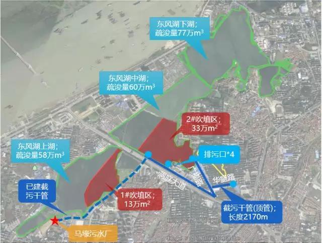 工程的实施可以有效避免新的增量污泥进入东风湖,减少底泥内源污染释放,从而改善东风湖水质,提供良好的水生生境和促进水生态系统修复,为实现2018年年底东风湖消除黑臭,2020年达到水功能区划的目标奠定基础。