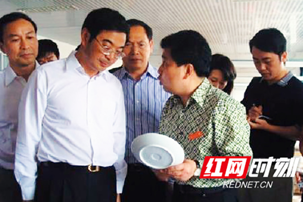 许君奇(右二)向时任湖南省委书记的周强(左二)介绍华联瓷业生产的瓷器。