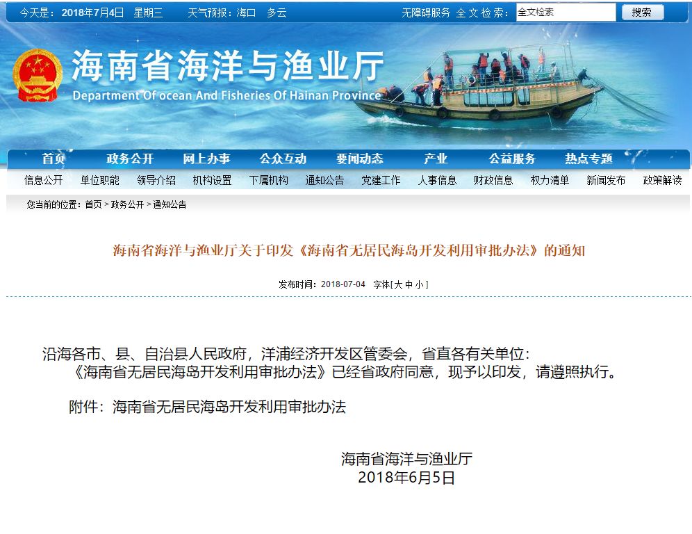 海南省海洋与渔业厅4日公布《海南省无居民海岛开发利用审批办法》,明确单位或个人申请开发利用无居民海岛,应向省级海洋行政主管部门提出申请,并提交无居民海岛开发利用申请书、具体方案和项目论证报告。