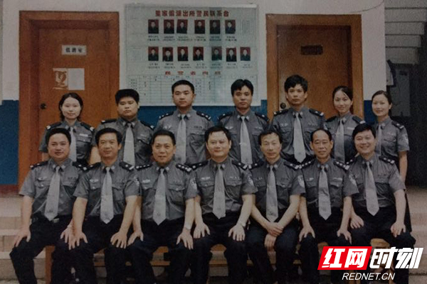 1999年,张黎明(后排左三)刚被调来董家塅派出所时与同事的合影。