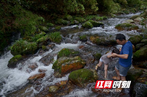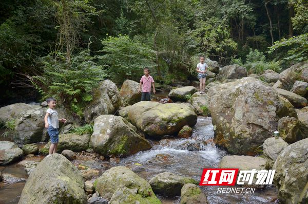 不少小朋友快乐的在山溪嬉戏,享受着难得的清凉。