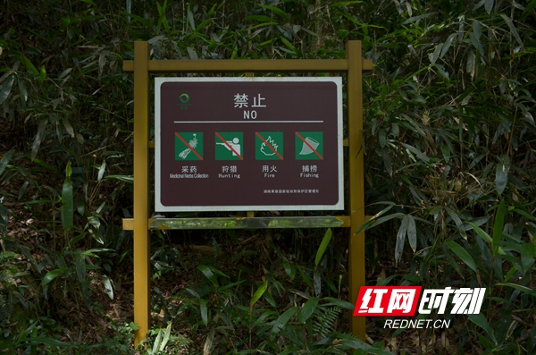 山中四处可见一些标语,人与动物、植物在这里得到和谐相处。