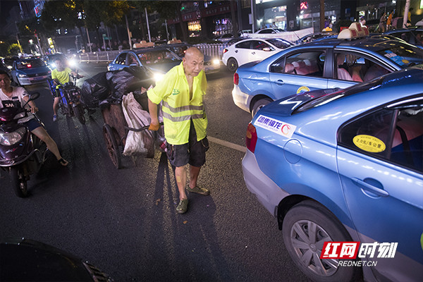 廖振杰拉着垃圾车穿梭在车流中,一不留神可能就会碰到。特别是电动车,没有声音和灯光,速度也快,和他擦身而过时,经常吓得他冒冷汗。