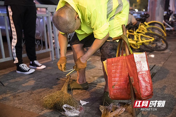 解放西路的夜宵摊很多,地上有许多被丢弃的竹签。因为竹签过长不能扫进撮箕,廖振杰只能先用手将竹签一一折断,然后再放进撮箕。