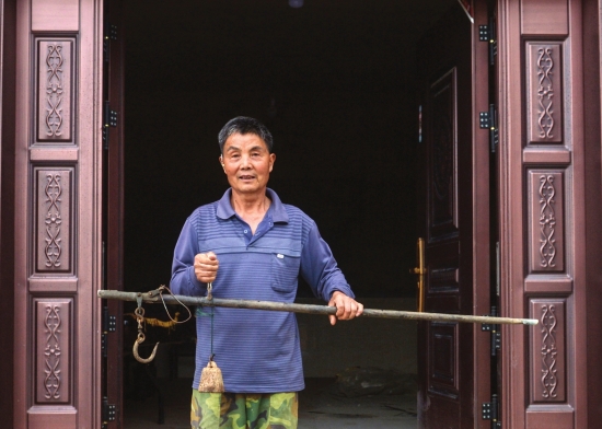 5月18日,长沙县开慧镇葛家山村协家组,村民李取如在自家两层楼房前展示当年分田到户时分的一杆秤和秤砣。组图/记者杨旭(图源:《潇湘晨报》)