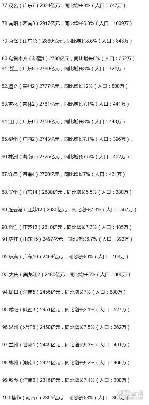 2017年GDP不足3000亿元的城市(不含100强以外)
