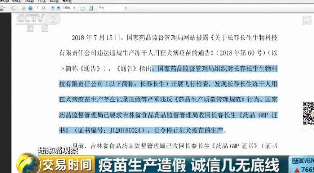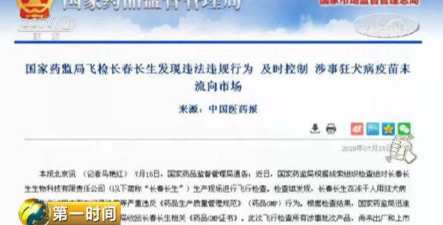 2018年7月15日,国家药品监督管理局发布消息称,长春长生生物科技有限责任公司狂犬病疫苗生产过程中存在记录造假等行为,已责令该公司停止生产狂犬疫苗,并对相关违法违规行为立案调查。