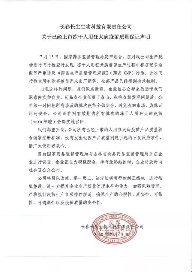 7月17日中午,长生生物在官方网站发布公开声明称,公司所有已经上市的人用狂犬病疫苗产品质量符合国家注册标准,没有发生过因产品质量问题引起的不良反应事件,请广大使用者放心。