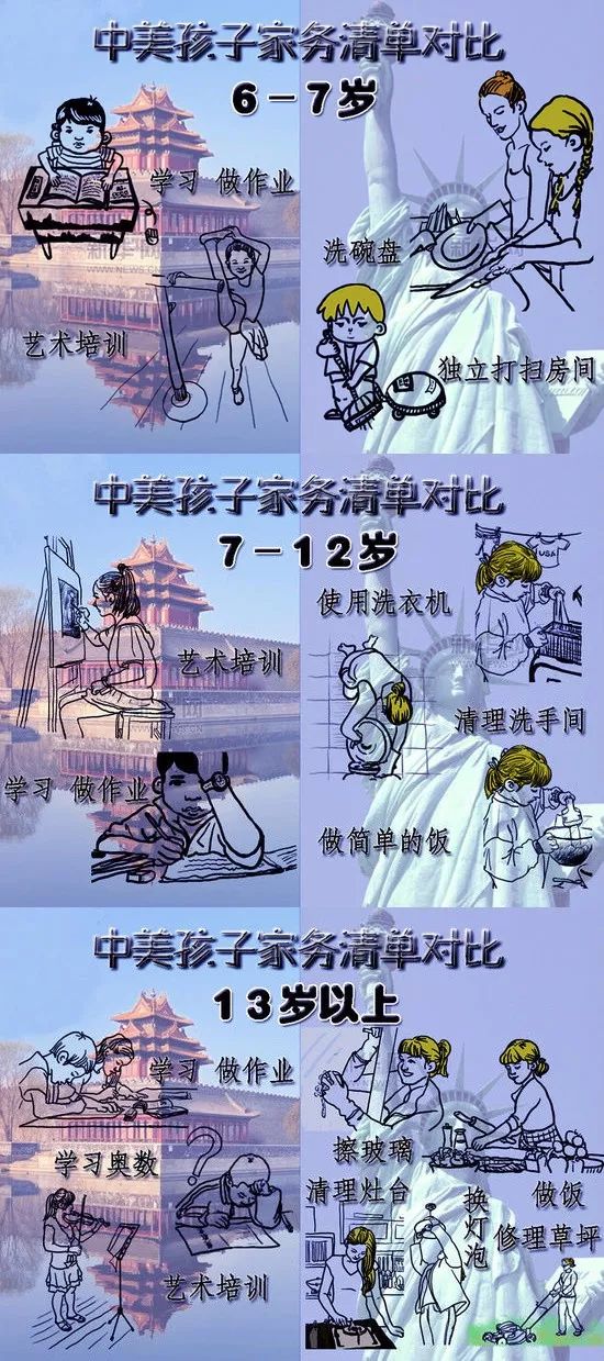 据中国青年报报道,相关调查显示,美国孩子平均每日劳动时间为72分钟,韩国孩子为42分钟,其他国家的孩子每日的劳动时间也较多。与这些国家相比,中国孩子每日劳动时间最少,平均为每日12分钟。