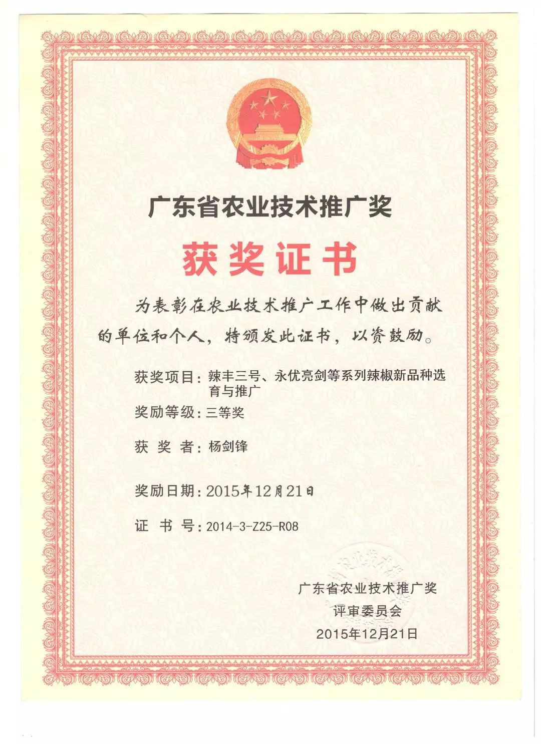 通过技术传承与创新,8年来,杨剑锋参与选育了几十个辣椒新品种,在全国有20多万亩的推广种植面积,其中3个获得了广东省农作物品种审定,1个获得了湖南省农作物审定。