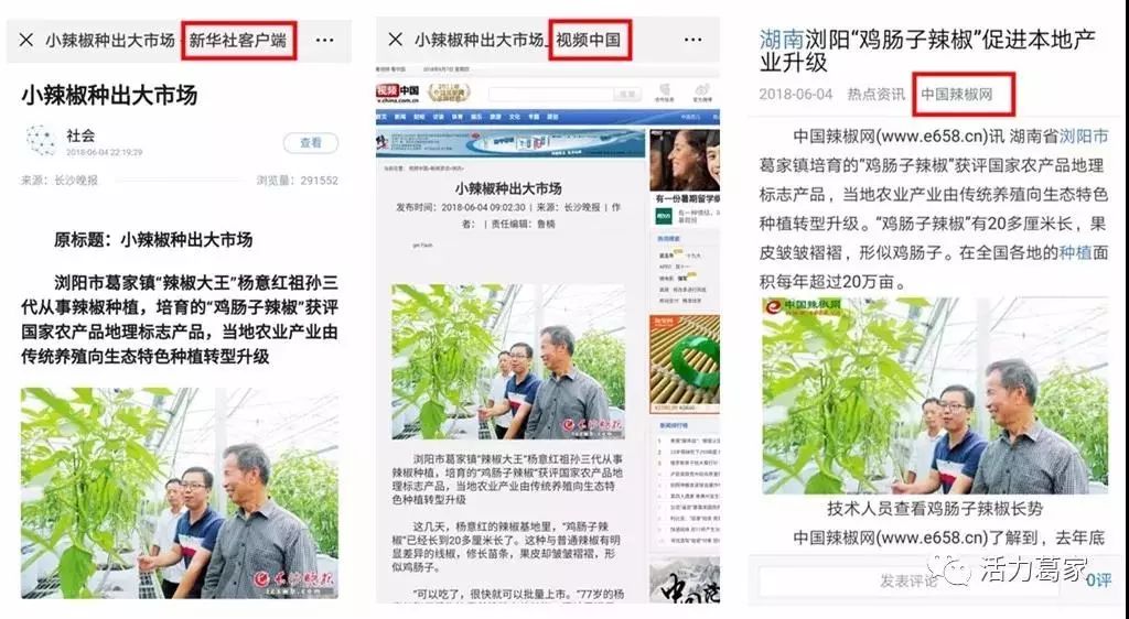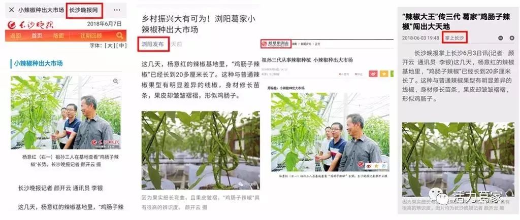 2017年11月,“鸡肠子辣椒”获评国家农产品地理标志产品,成为浏阳首个“国字号”蔬菜品牌,先后登上人民日报、新华社客户端、长沙晚报等多家中央省市媒体。以“葛农匠”为品牌的葛家“鸡肠子辣椒”上市后成功进驻长沙麦德龙等大型超市及中高档餐馆。目前,公司蔬菜基地面积已达100多亩,其中核心种植区面积达50亩,核心区大棚覆盖面积70%以上。每年为周边农户及基地繁育优质的种苗50多万株,并提供完善的种植技术及农资服务,为浏阳蔬菜产业发展壮大提供了助力。