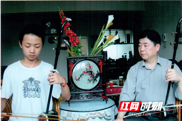 衡阳湘剧国家级非物质文化遗产代表性传承人谭东波在教弟子拉二胡。