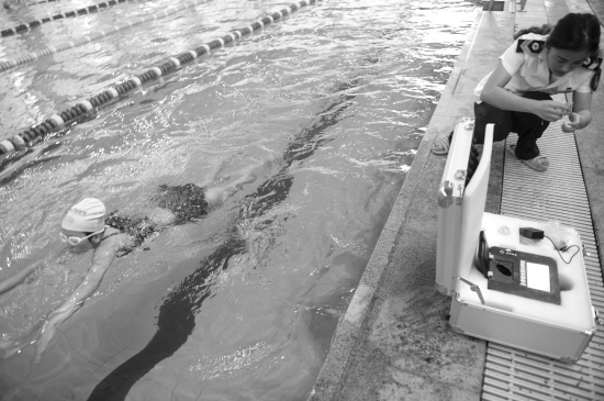 下午2点半,长沙市卫生计生综合监督执法局党总支书记王艳一行6人来到恒大雅苑内的游泳馆,前来登记免费游泳的中小学生已排起了长队。检查完游泳馆的卫生许可证等相关证件后,卫生监督员开始对水质进行检测。卫生监督员拿出量瓶,蹲在游泳池边取水。在简单洗瓶后,卫生监督员取出距水面30cm以下的水,放入多参数水质分析仪,将浊度归零后取出量瓶,加入试剂后又放进分析仪,量出浊度为0.01NTU。随后,卫生监督员又对游泳池的PH值、余氯值进行检测,结果分别为7.57、0.41mg/L,“检测结果均符合标准”。该局公共场所卫生监督科科长石军介绍,这次主要是对比检测结果,确定游泳场馆卫生是否合格,一旦发现不合格的地方,他们会进行教育和指导。除了水质检测,还要检测场馆的安全设施。