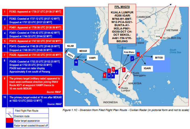 报告提供的MH370失事前的飞行示意图,虚线为其偏离航线后的飞行路径