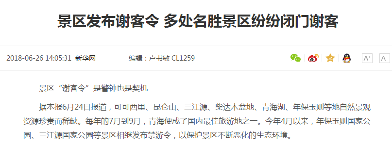 随着社会文明的进步,环境保护成为各国高度重视的问题之一。经过人们的不懈努力,生态环境的破坏情况已经有所改善,但是“景区污染”这一问题却依旧频繁被曝光。“青海湖景区面临垃圾污染,蓝天白云下垃圾成堆”“丽江玉龙雪山被架设3条索道,每条索道都伸入自然保护区的核心区”等新闻频频爆出,甚至有不少景区因破坏严重,已经发出“谢客令”。