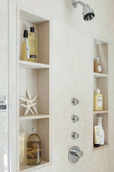 壁龛设计:利用好墙壁做几个内嵌,可以解决杂乱的浴室空间,后期连隔板都不用搭了。