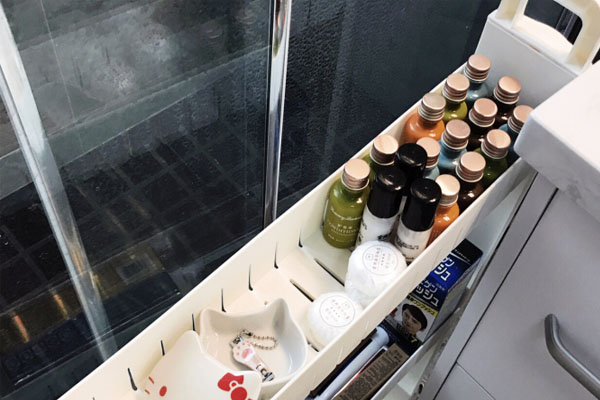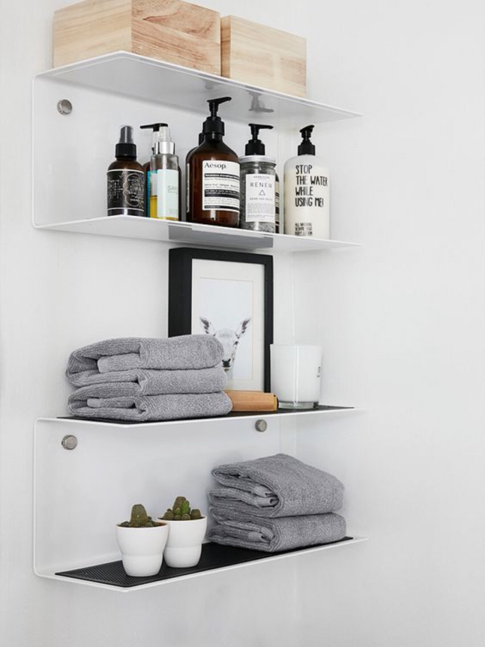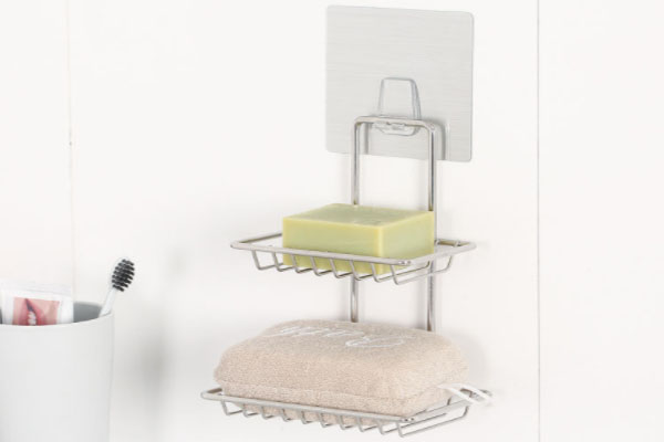 吸盘置物架:为了让洗手台更显宽阔,牙刷杯、瓶子、肥皂都可以放在吸盘式的架子上,镂空的设计在浴室非常有必要,做好干湿分离,可以防止潮湿、发霉,减少细菌滋生。