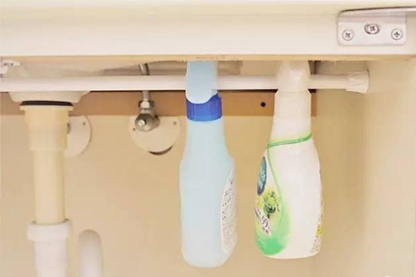 水斗下面的水管虽然是障碍,但也不难解决。 只要在柜子的上方撑起一根伸缩棒,像喷雾清洁剂之类带把手的瓶子,就能利用瓶口的把手将瓶子挂起来!