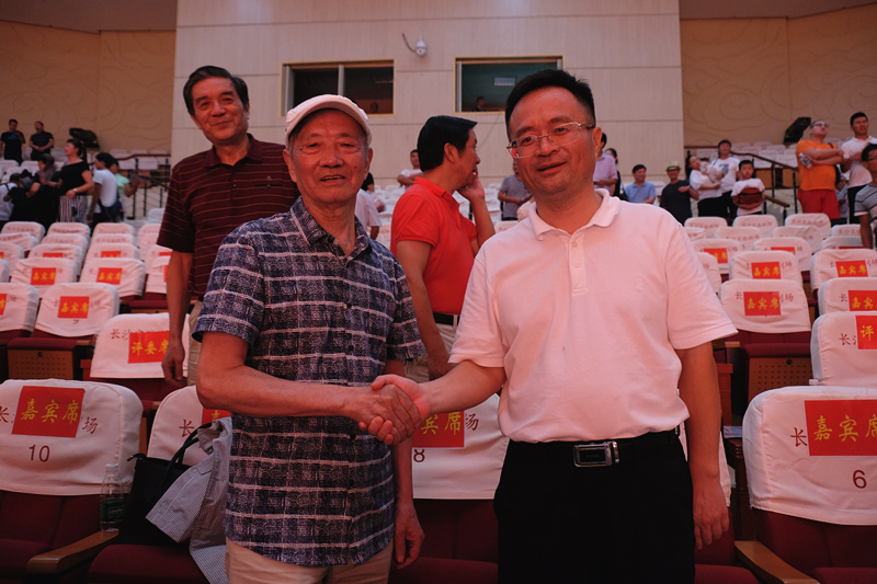 首演结束后,市委书记喻文(右)与著名剧作家甘征文合影
