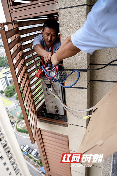 “今天这个只是楼层高,难度处于中下了。”严高和刘丹介绍,碰到更难处理的安装情况,有时候在一户人家要连续忙碌六七个小时。比如旧楼宇安装空调,由于建筑设计没有空调位,只能全身悬空去打孔,然后踩在角铁横架上安装室外机,危险性更高。