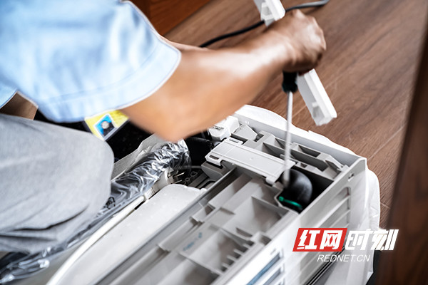 近日,记者跟随格力空调的两位空调安装工人刘丹、严高,来到长沙市雨花区高升时代广场位于27楼的一户人家,他们家要安装4台空调,也就意味着刘丹、严高要在这里至少忙碌一个上午了。