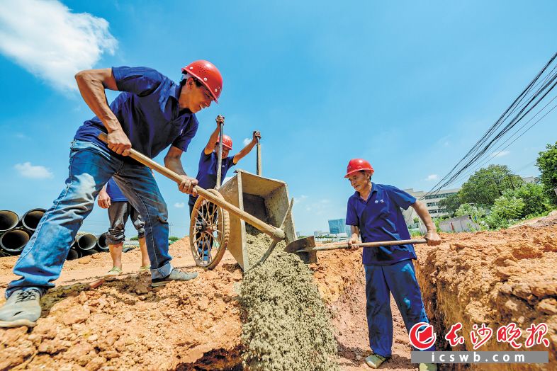 昨日10时许,京港澳高速东辅道(远大路—西龙路)提质改造工程的管道安装工程现场,气温高达38摄氏度,工人们顶着烈日施工。长沙晚报记者 陈飞 摄