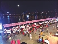 8月3日,华灯初上,渔人码头美食街已人潮涌动,仍有人群不断涌入。与亲友临岸而坐,吃着美食,吹着江风,赏着江景,只要愿意,还有卖艺帅哥为你弹一曲吉他,唱一首情歌……