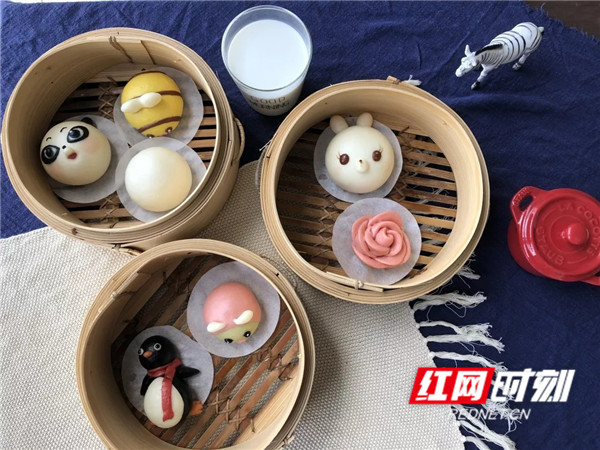 当普通的菜已经不能满足米粒的时候,她开始制作包点,学习包点到现在也不过半年时间,这半年,从最开始简单的包子到最后可以用包子的模式做出各种形状,都是靠米粒一点一滴自我摸索。面粉加糖,加奶,如何搅拌都需要精准的计算,不过这些看似复杂的工序,其实并不复杂,只要跟着步骤走,就能很好的做出一个漂亮的包点。