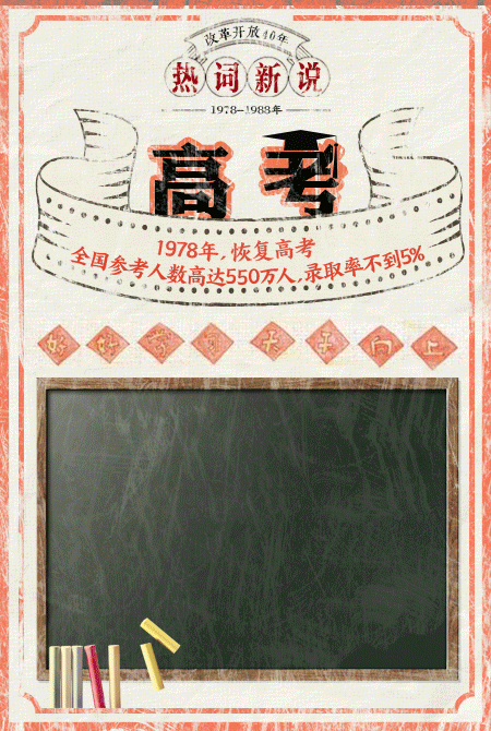 想当年:1977年,为加快人才培养,进行了唯一一次冬季高考,湖南等各省份均单独命题。1978年,迎来恢复高考后录取的第一批大学生,高考日期是当年的7月7-8号两天,当时的考试科目,包括政治、语文、数学、历史、地理和英语。1978年全国参考人数高达550万人,录取率不到5%。