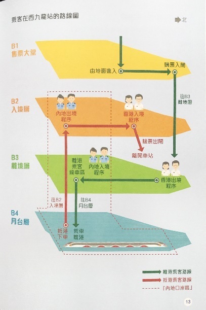 抵达香港的乘客:在B4层月台下车,进入B2办理出境内地程序,离开内地口岸区,进入同一层的香港口岸区,办理入境香港程序,然后出站。