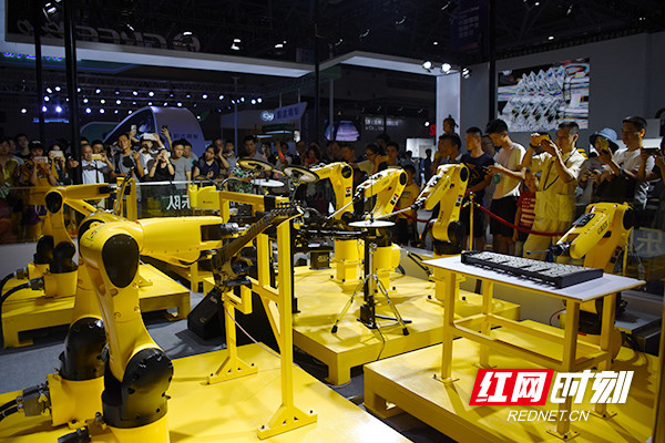 一曲《歌唱祖国》在格力展台奏响,现场,吉他、键盘、架子鼓,专业的机器人乐手们配合默契,迅速吸引了不少市民前来观看。