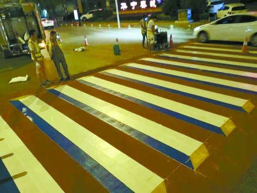 8月26日晚,郴州城区青年大道华宁春城路段,施工人员连夜完成了首条3D斑马线的施划,标志着该市首条3D斑马线正式“上路”。