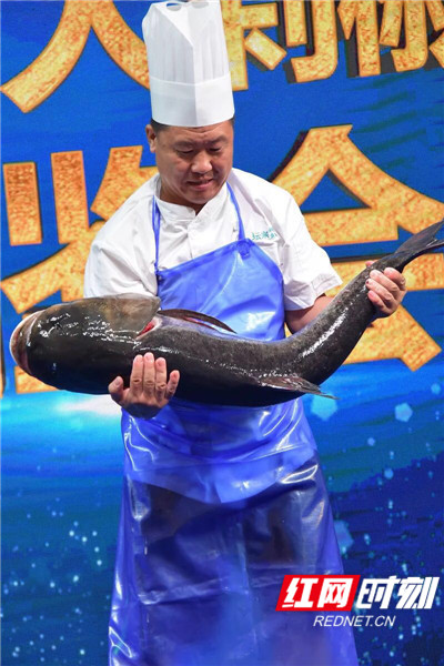 42斤的大雄鱼在厨师的手中翻腾,滑不留手,显得野性十足,让台下观众一片惊呼声。戴宗介绍,这种天然放养的大雄鱼,不喂饲料,只吃浮游生物长大,而且生长在两万亩以上的水域之中,要长到42斤,需要15年以上的时间,这种大雄鱼近乎野生,所以力气很大,当然,做成剁椒鱼头也格外味美。