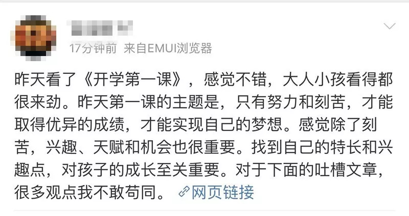 也有家长说,感觉《开学第一课》不错,大人小孩看得都很来劲。