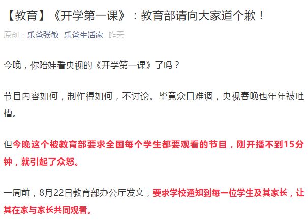 “乐爸生活家”微信公众号昨晚发布的文章《<开学第一课>:教育部请向大家道个歉!》阅读超过10万。