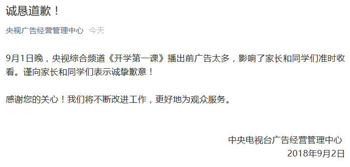 9月1日晚,央视综合频道《开学第一课》播出前广告太多,影响了家长和同学们准时收看。谨向家长和同学们表示诚挚歉意!