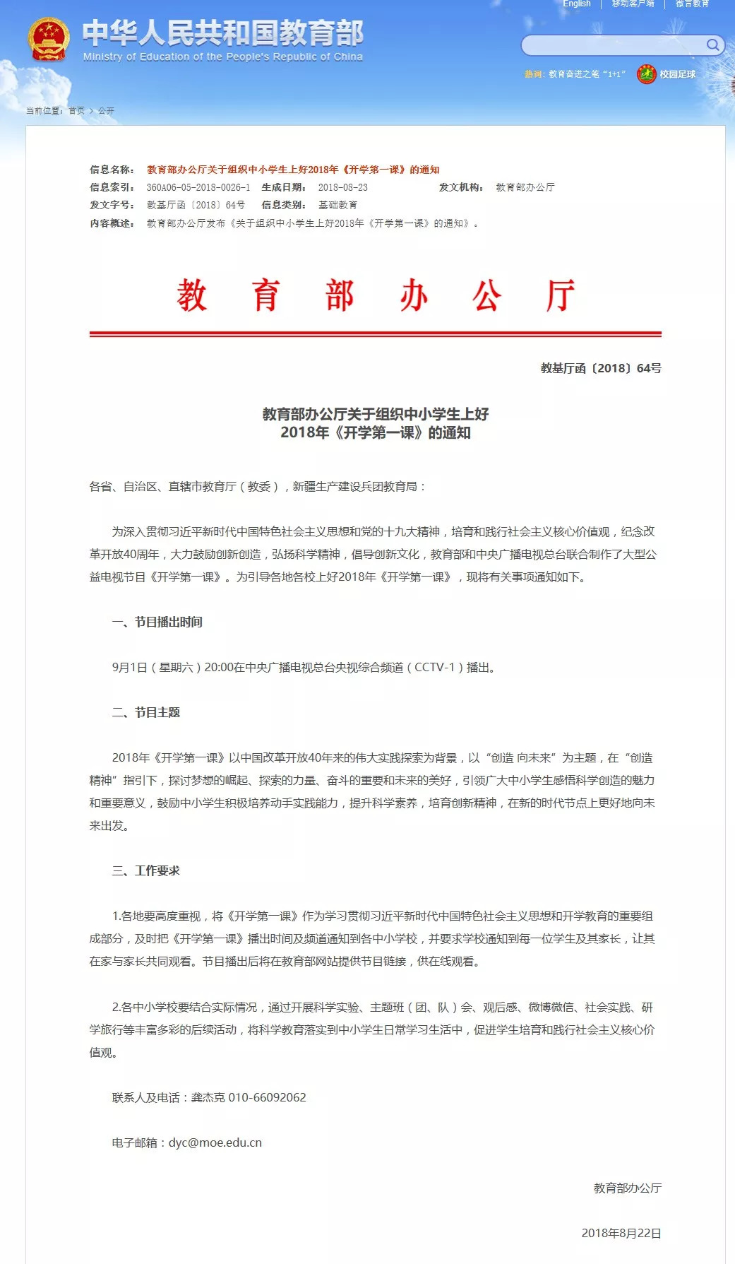 一周前,8月22日教育部办公厅发文,要求学校通知到每一位学生及其家长,让其在家与家长共同观看。