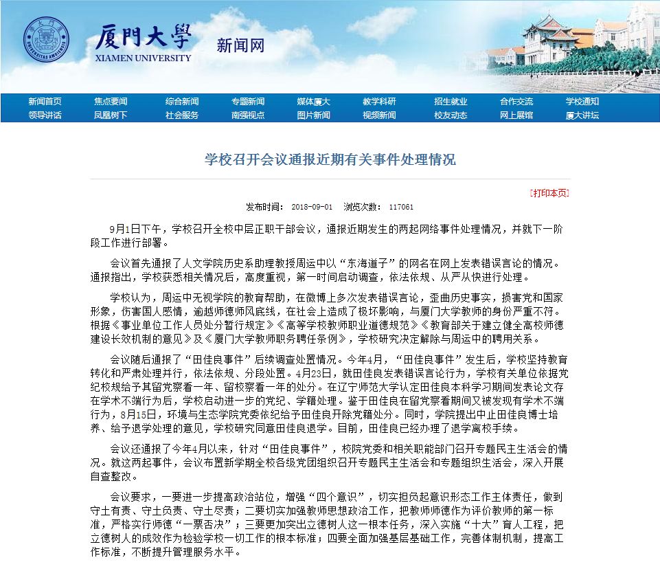 9月1日,厦门大学通报了“田佳良事件”事件处理结果: