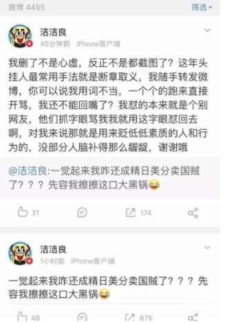 后来,@洁洁良 删除了所有微博,注销了微博账号。并表示自己不是因为心虚,关于这件事是网友们断章取义。