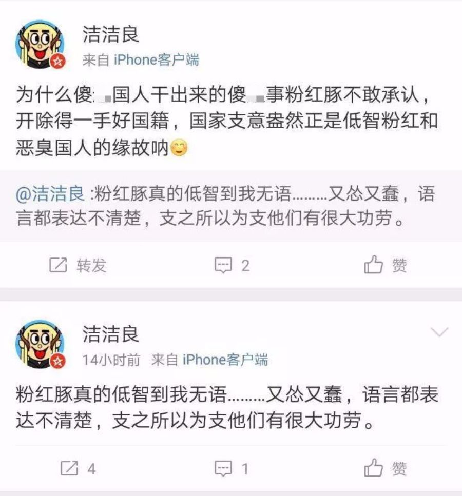 今年4月,一个新浪微博名为@洁洁良的账号公开发布辱华言论。