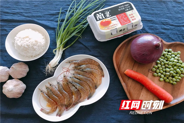 2.热锅热油将洋葱炒香,放多胡萝卜青豆煸炒,再加入处理好的虾煸炒至变色,再加入米饭炒散,调味出锅,整形