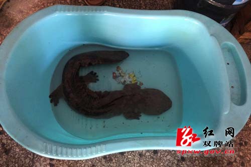 双牌县森林公安局接群众陈某电话称:在双牌大坝源头拾获一条长有“四脚”的怪鱼。民警随即赶赴现场,经初步鉴定,这条“怪鱼”是国家二类保护水生野生动物大鲵,它是世界上现存最大的也是最珍贵的两栖动物,它的叫声很像婴儿的哭声,因此人们又叫它“娃娃鱼”。这条娃娃鱼,全身呈灰黑色,长76厘米,重6.4斤。娃娃鱼生长在山涧溪流中,对生态环境要求极高,数量稀少。在该县境内发现这么大的野生大鲵,表示双牌水库、日月湖湿地公园河水水质极佳,生态环境良好。