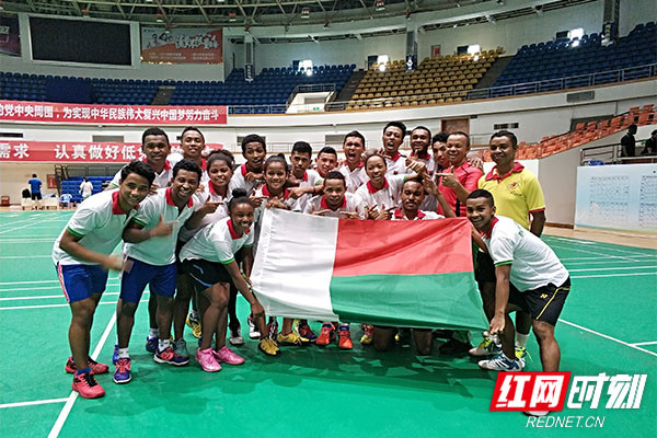 回国前,马达加斯加羽毛球国家队在益阳奥林匹克公园体育馆合影。